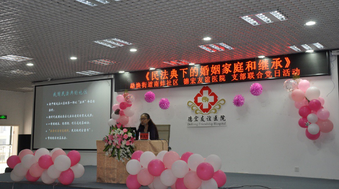 阳春三月、万物复苏,在这个春意盎然、孕育着生机和希望的季节,德宏友谊医院近一百名员工欢聚一堂,共同迎来了第111个“三八”国际妇女节。为提高广大妇女普法意识和维权能力,维护广大妇女同胞的合法权益,营造关爱妇女的氛围,2021年3月9日下午,德宏友谊医院妇联邀请云南春晖律师事务所专职律师张义兰到院宣讲《民法典下的婚姻家庭和继承》。